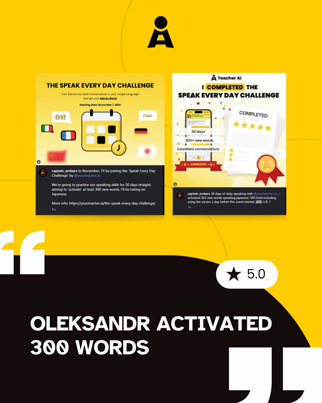 Use the Teacher AI app to speak every single day for 30 days straight. If you miss a day, you don't get the refund.