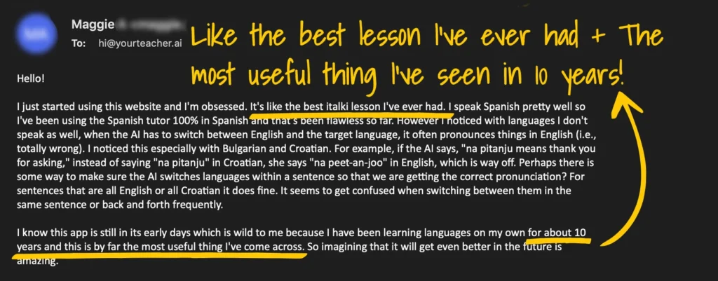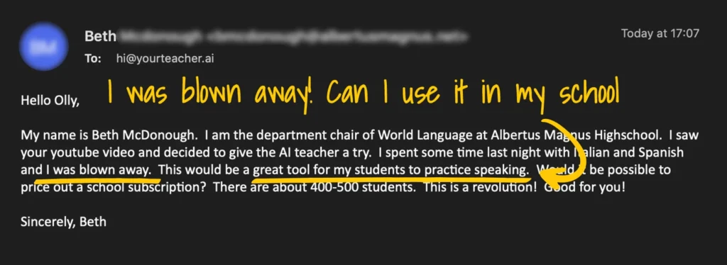 “People ask me all the time what the absolute best way to learn a language is, and I am frustrated when I have to tell them to spend a lot of time with an expensive language tutor with limited availability. Teacher AI will change everything.”